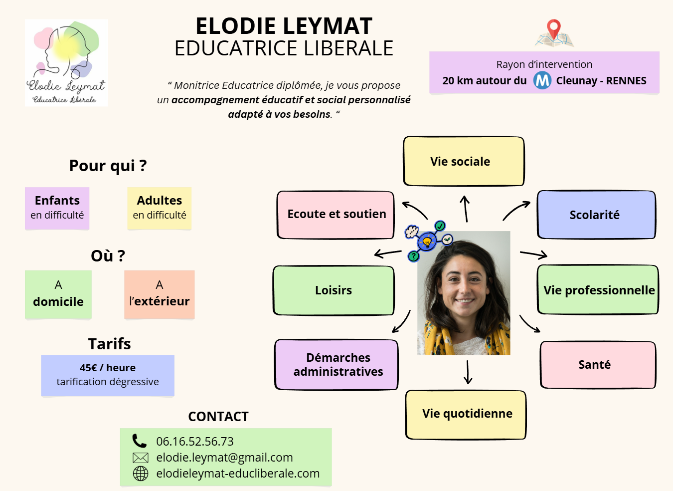 A travers cette activité libérale, je vous propose de vous rencontrer afin d' identifier ensemble vos besoins. Par la suite, je pourrais vous proposer des accompagnements ponctuels ou réguliers pour vous aider à maintenir ou développer votre autonomie au quotidien, votre vie sociale et votre bien-être.